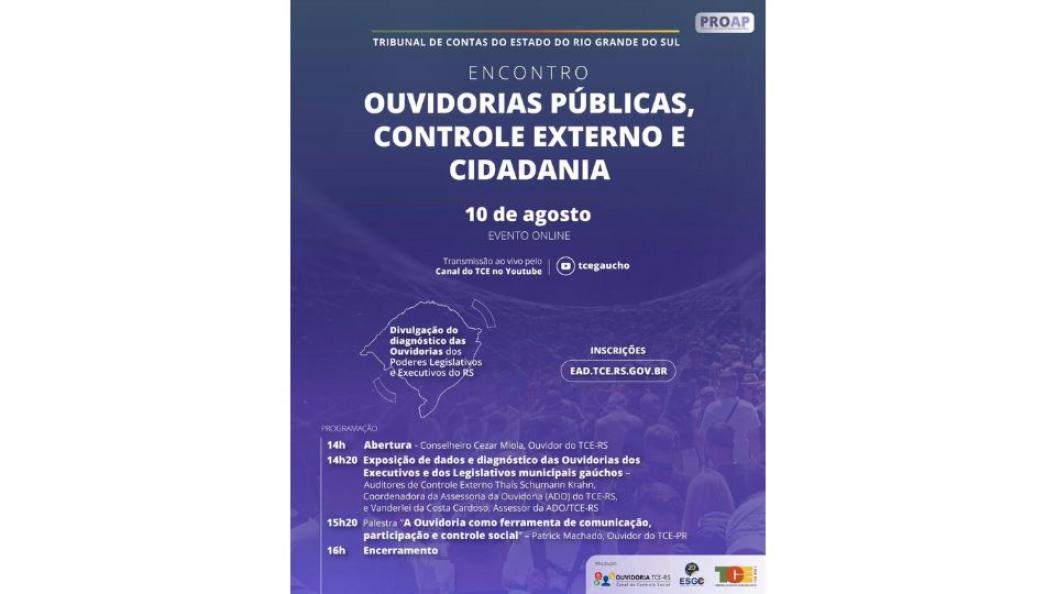 O Tribunal de Contas do Estado (TCE-RS) apresenta, no dia 10 de agosto, o resultado de recente pesquisa sobre a situação das ouvidorias dos poderes legislativos e executivos municipais no Rio Grande do Sul. O diagnóstico será fornecido durante o “Encontro Ouvidorias Públicas, Controle Externo e Cidadania”, a partir das 14h no canal do TCE-RS no Youtube (https://www.youtube.com/tcegaucho). O evento tem, também, como propósito incentivar a implantação e o aprimoramento das ouvidorias públicas municipais, visando garantir o exercício do controle social e a participação cidadã.