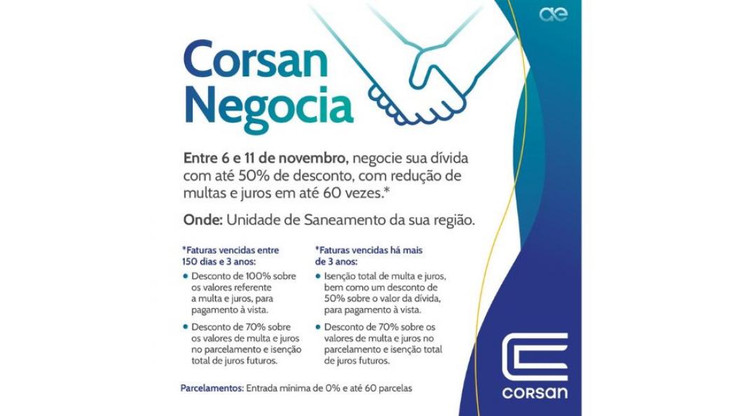 Corsan lança programa de negociação de dívidas com até 50% de descontoCorsan lança programa de negociação de dívidas com até 50% de desconto