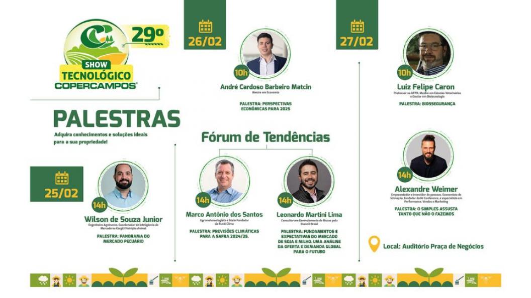 No 29º Show Tecnológico Copercampos, os visitantes terão a oportunidade de participar de palestras especiais que abordarão temas fundamentais para o agronegócio e economia. Entre os dias 25 e 27 de fevereiro, especialistas de renome compartilharão seus conhecimentos em diversas áreas, contribuindo para o aprimoramento profissional e para tomadas de decisões mais embasadas no campo. Confira a programação: