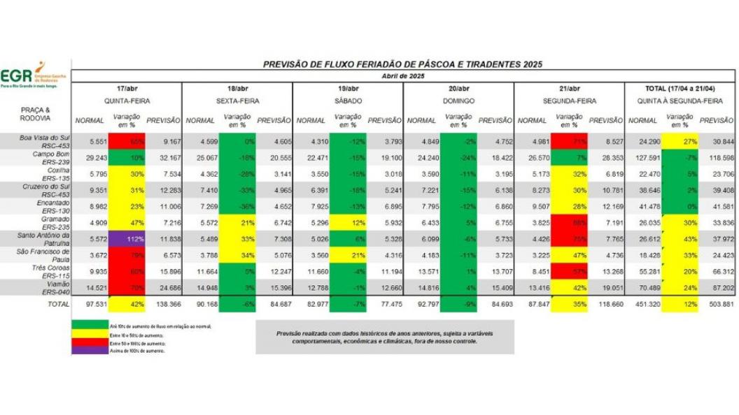 Por fim, no trecho da RSC-453, entre Garibaldi e Estrela, o fluxo deve crescer 65% na quinta-feira e 71% na segunda-feira. Nas demais rodovias administradas pela EGR, o movimento também será intenso, mas dentro dos padrões esperados para um feriadão prolongado.