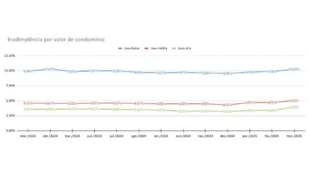 Em março, as taxas de inadimplência de condomínio no país de até 500 reais atingiram 10,26%, alta de 0,36 ponto percentual em relação a fevereiro e segunda maior marca dos últimos 12 meses. Já nos condomínios de até 1.000 reais, o índice chegou à marca recorde de 5,03% (alta de 0,31 ponto percentual em relação ao mês anterior). E nos condomínios acima de 1.000 reais, a taxa também foi recorde, de 3,93% (alta de 0,60 ponto percentual em relação a fevereiro).