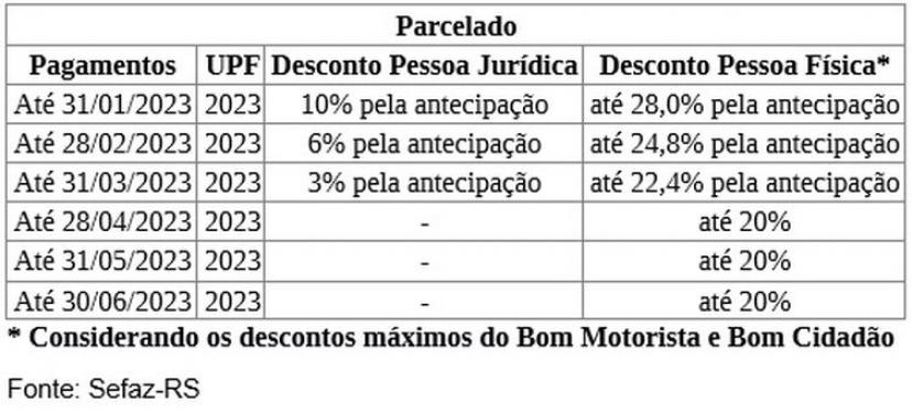 Confira abaixo a tabela com os descontos e o calendário para pagamento parcelado.