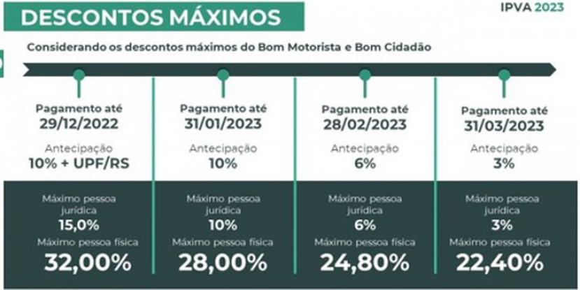 Além dos descontos pela antecipação, os proprietários que optarem pelo parcelamento também podem obter os descontos dos programas estaduais “Bom Motorista” e “Bom Cidadão”, se tiverem direito.