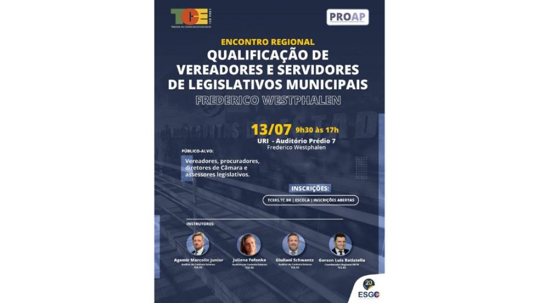 No dia 13 de julho, auditores do Tribunal de Contas do Estado (TCE-RS) irão palestrar no Encontro Regional de Qualificação de Vereadores e Servidores de Legislativos Municipais, em Frederico Westphalen. O evento será realizado no Auditório Prédio 7 da Universidade Regional Integrada do Alto Uruguai e das Missões (URI), e tem como público-alvo vereadores, procuradores, diretores de Câmaras, assessores legislativos, controladores internos e universitários de Guaporé e região.