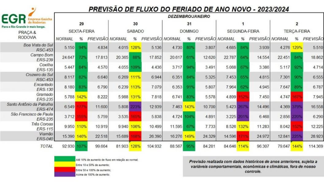 A estimativa da EGR é que a circulação tende a aumentar 123% na ERS-474 (praça de Santo Antônio da Patrulha), com estimativa de 12,9 mil veículos e 68% na ERS-040 (praça de pedágio de Viamão), podendo alcançar 26,3 mil durante todo o dia. Na ERS-235 (praça de São Francisco de Paula), 65%, com 5,8 mil usuários, e na ERS-235 (pedágio de Gramado), 7,8 mil, índice 31% superior a um dia normal.