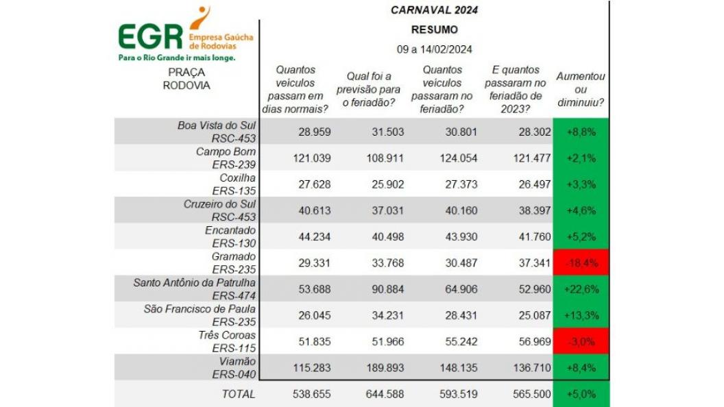 A Empresa Gaúcha de Rodovias (EGR), por intermédio da Gerência Operacional (Goper), divulgou o balanço de Carnaval nas estradas administradas. De acordo com o  levantamento, 593,5 mil veículos passaram pelas dez praças de pedágio da EGR entre sexta (09.02) e quarta-feira (14.02). Em comparação com o Carnaval de 2023, foram 28 mil a mais.