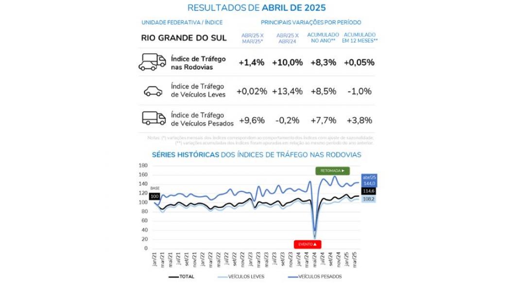 O acumulado parcial de 2025 também revela uma tendência de retomada: o total de viagens nas rodovias gaúchas cresceu 8,6% em relação ao mesmo período do ano anterior, com destaque para o aumento no tráfego de veículos leves (+8,3%) e pesados (+11,5%). Já no recorte dos últimos 12 meses, observa-se uma estabilidade no índice agregado (+0,05%), resultado do avanço no tráfego de veículos pesados (+3,8%) e da queda nos leves (-1,0%).