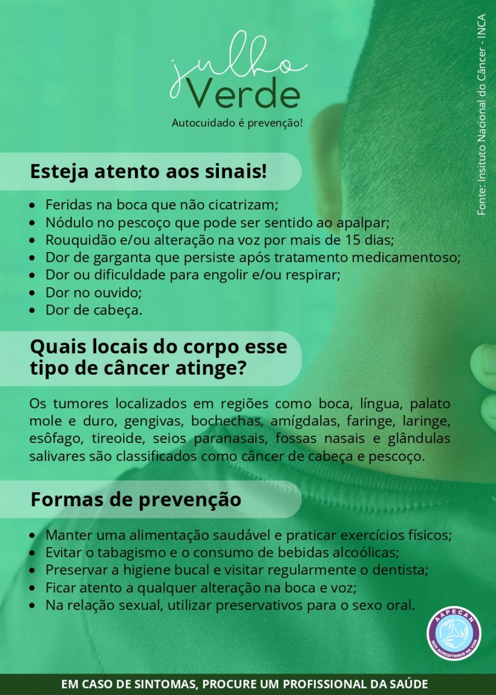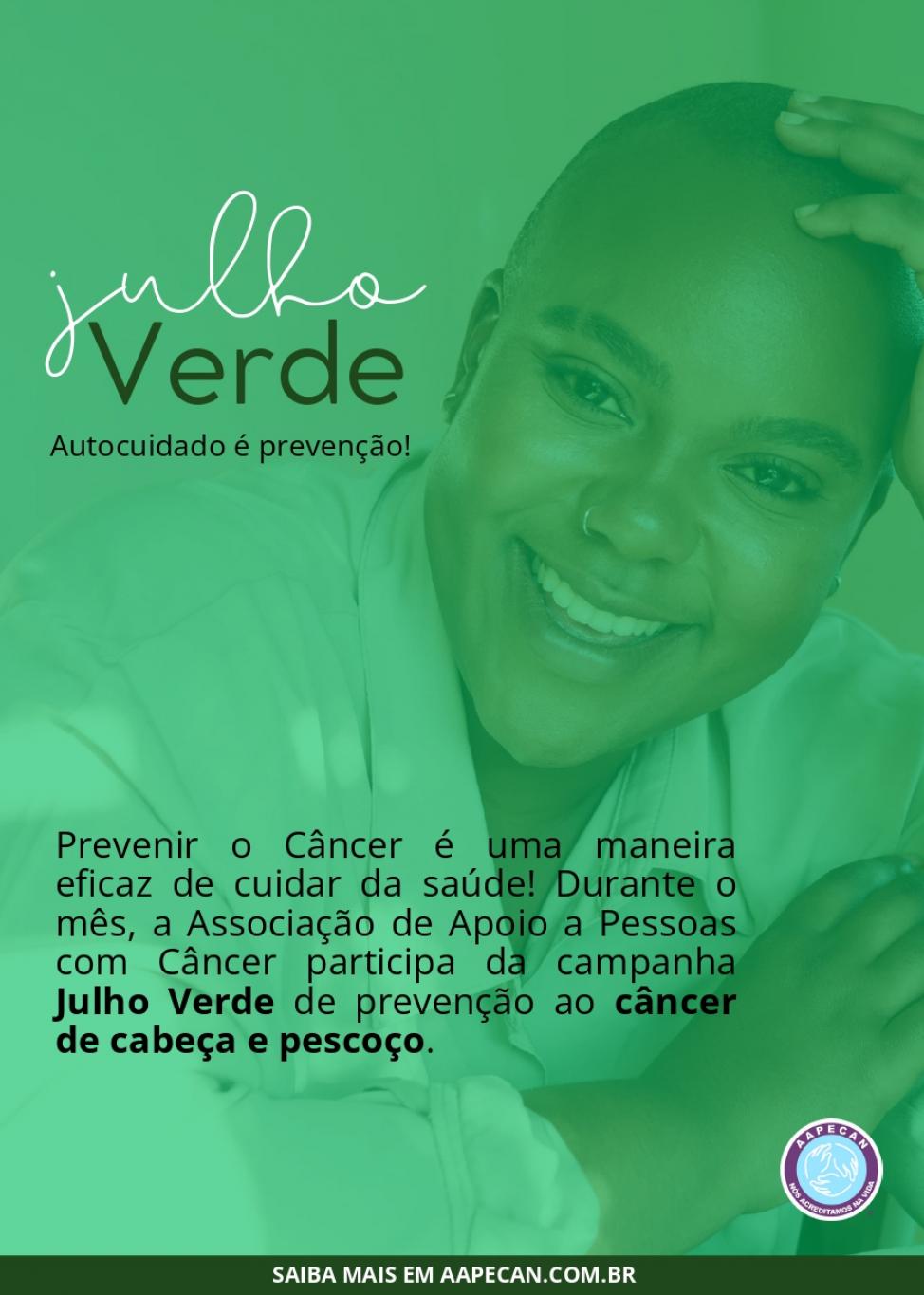 Neste mês de julho, a Associação de Apoio a Pessoas com Câncer (Aapecan) trabalha a campanha Julho Verde, com o objetivo de conscientizar a população sobre a importância da prevenção ao Câncer de cabeça e pescoço. A campanha disponibiliza palestras informativas, visando reduzir situações de risco e fortalecer aqueles que já estão em tratamento.