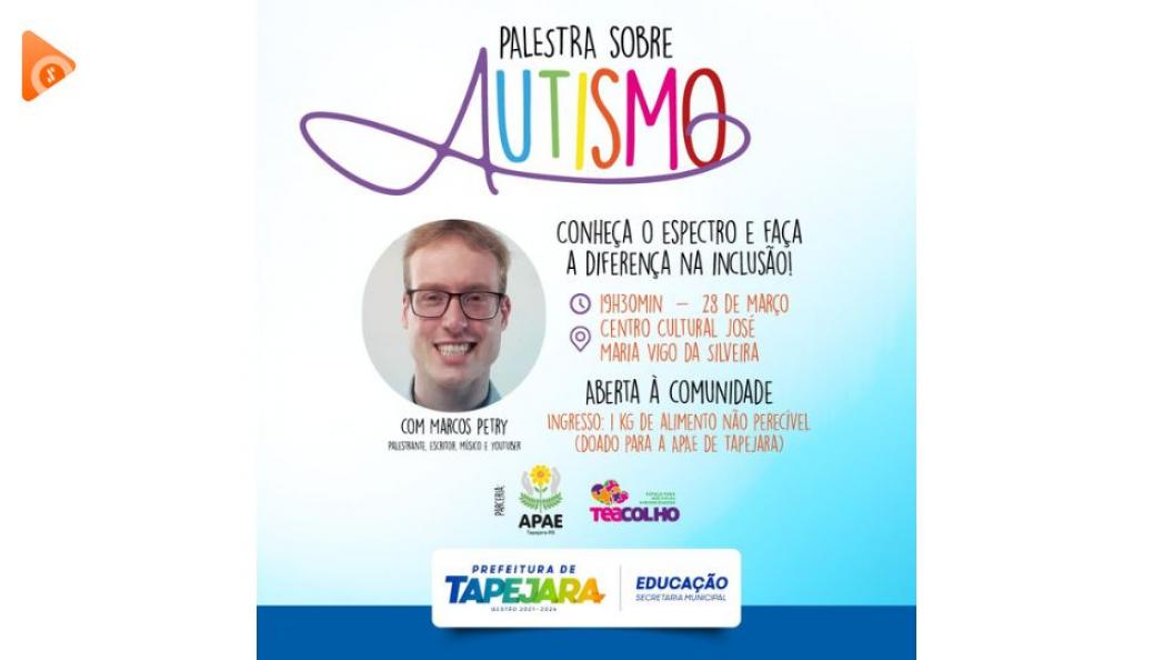 Participe da Palestra sobre Autismo, com o palestrante Marcos Petry, no dia 28 de março, às 19h30min, no Centro Cultural José Maria Vigo da Silveira de Tapejara.