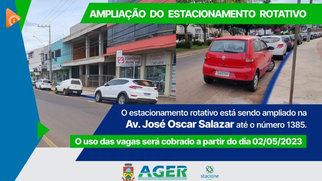 A Prefeitura de Erechim, por meio da Secretaria de Obras Públicas, Habitação, Segurança e Proteção Social de Erechim e Diretoria de Trânsito, informa a população, que o estacionamento rotativo, administrado pela concessionária Stacione Erechim, vai entrar em funcionamento na avenida José Oscar Salazar. O uso das vagas será cobrado a partir do dia 02/05/2023, as vagas iniciam no entroncamento com a avenida Caldas Júnior e vão até o número 1385, conforme o decreto número 5.560/23.