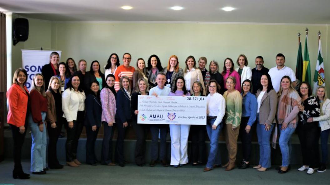 Na tarde desta terça-feira, 15, no auditório da Fundação Hospitalar Santa Terezinha de Erechim, foi realizada a entrega de R$ 28.571,04, arrecadado pelo colegiado das primeiras-damas da AMAU, em ações sociais.