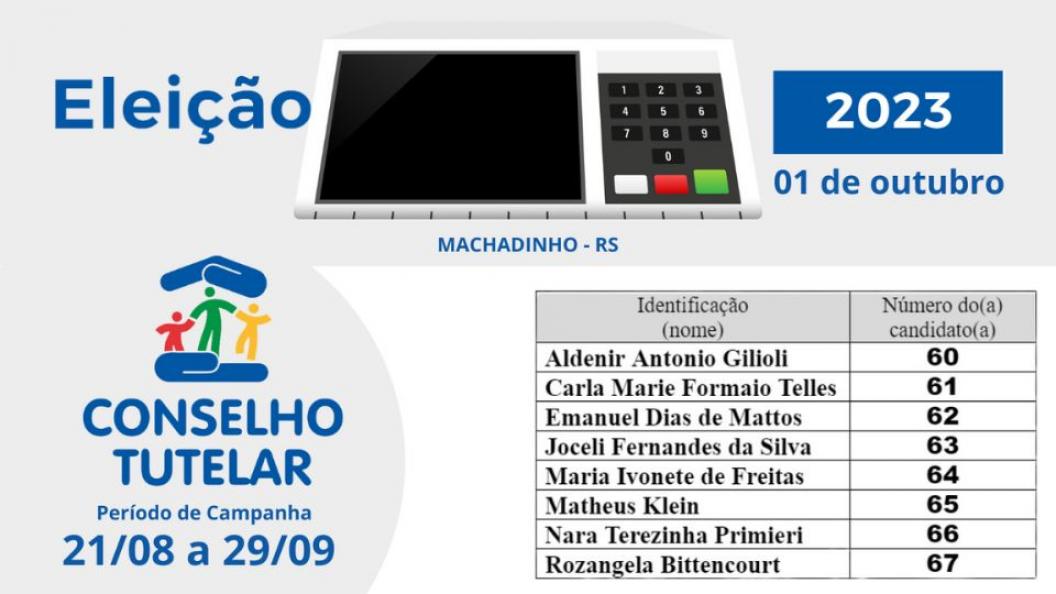 O Conselho Municipal dos Direitos da Criança e do Adolescente – COMDICA de Machadinho iniciou ainda no mês de fevereiro de 2023, o cumprimento de determinações para a organização da eleição de membros, assim como determina a legislação. Em abril deste ano de 2023 lançou o edital que tornou público o período e normativas relativas à eleição de Conselheiros Tutelares, que ocorrerá no dia 01 de outubro. Neste momento o processo que teve já cumpriu as etapas eliminatórias, apresenta através do edital nº 009/2023 de 14 de agosto, o número dos candidatos, aprovados nas provas escritas e aptos a concorrerem ao pleito eleitoral.