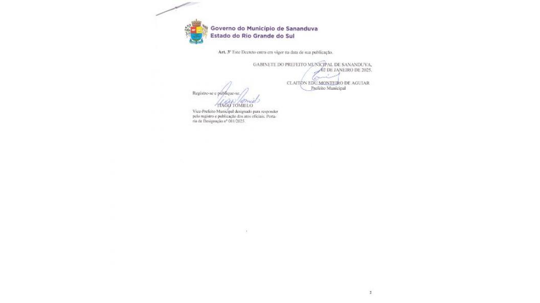 O Prefeito Municipal de Sananduva Claiton Edu Monteiro de Aguiar, no uso de suas atribuições legais e de conformidade com o que dispõe o Art.86, Inciso V, da Lei Orgânica do Município, decreta expediente exclusivamente interno nos Setores Administrativos do município, pelo período de 09 dias consecutivos, contados a partir da data de publicação do Decreto.