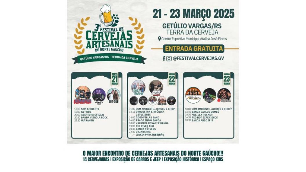A cidade de Getúlio Vargas, conhecida como a "Terra da Cerveja", se prepara para receber, a partir desta sexta-feira (21 de março), a 3ª edição do Festival de Cervejas Artesanais do Norte Gaúcho. O evento, que segue até domingo (23 de março), reunirá os principais nomes da produção cervejeira artesanal do Sul do Brasil, além de uma programação musical de peso e uma ampla praça de alimentação.