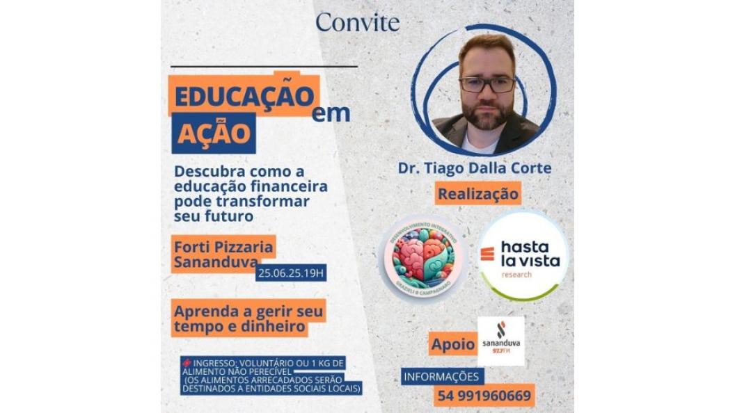 Participaram do Programa Estúdio Atualidades na manhã desta sexta-feira (20.06), a Professora Grazieli Borges Campagnaro e o Professsor Lucas Brambatti, na oportunidade os entrevistados falaram sobre a palestra "Educação em Ação" - Descubra como a educação financeira pode transformar seu futuro, com o Dr. Tiago Dalla Corte, que vai acontecer na próxima quarta-feira dia 25 de junho em Sananduva.