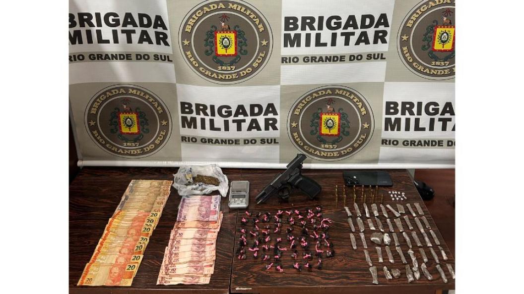 Durante patrulhamento, os policiais abordaram um homem que tentou fugir ao avistar as viaturas. Com ele, foram apreendidas uma pistola Bersa calibre 9mm, munições, 44 porções de maconha, 62 porções de cocaína e 13 porções de crack, além de uma balança de precisão, um celular e dinheiro.