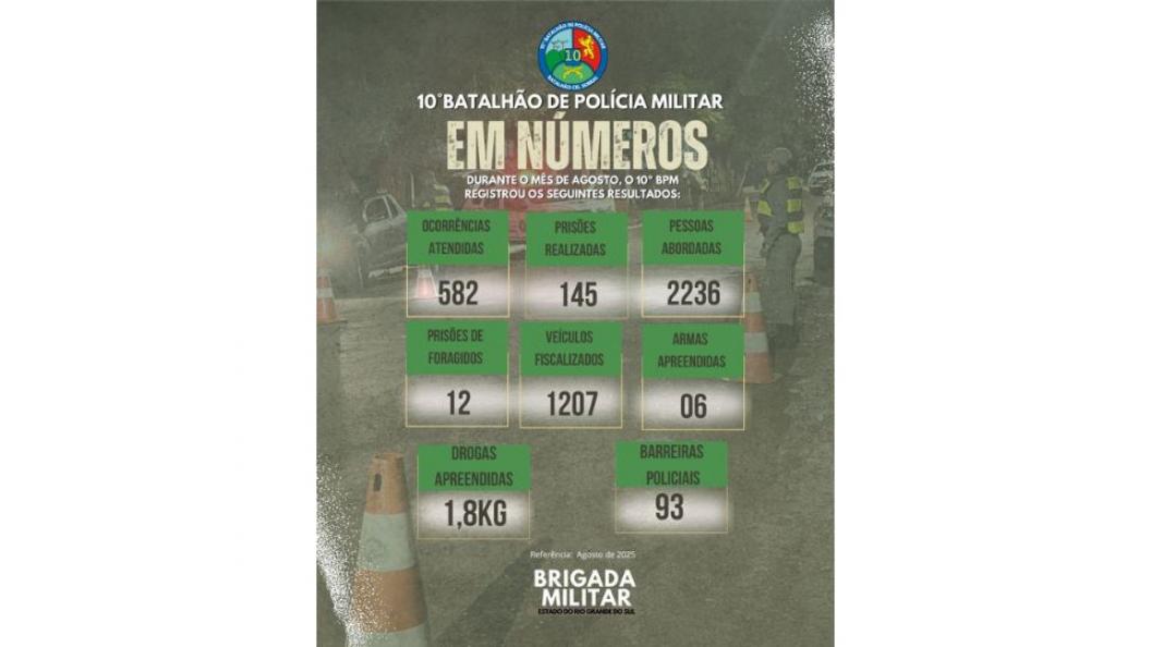 O 10º Batalhão de Polícia Militar, responsável pelo policiamento em 20 municípios da região, divulgou o balanço de atividades realizadas durante o mês de agosto de 2025. O resultado demonstra o compromisso da Brigada Militar com a segurança pública e a tranquilidade da comunidade.