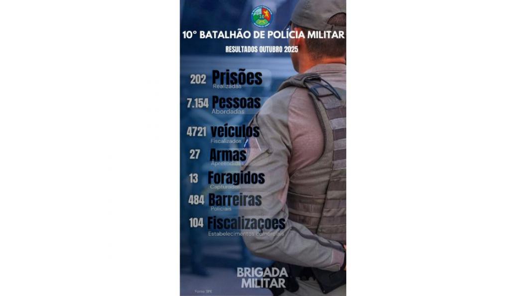 O 10º Batalhão de Polícia Militar (10º BPM), com sede em Vacaria e abrangência sobre 20 municípios da região Nordeste, divulgou o balanço das ações realizadas durante o mês de outubro de 2025.
