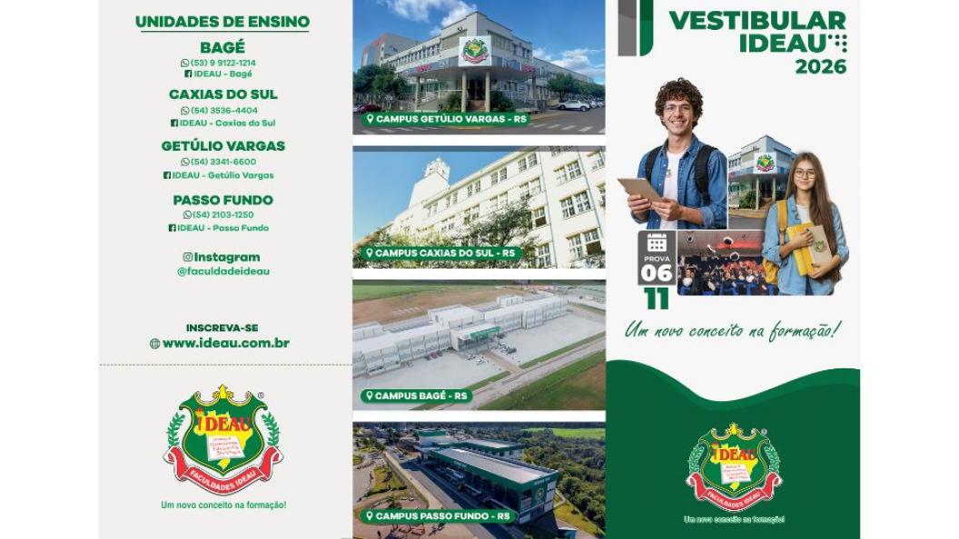 As Faculdades IDEAU estão com as inscrições abertas para o Vestibular 2026, que entra em seus últimos dias. A prova acontece na próxima quinta-feira, 6 de novembro, às 19h30, simultaneamente nas quatro unidades da instituição: Getúlio Vargas, Passo Fundo, Caxias do Sul e Bagé.