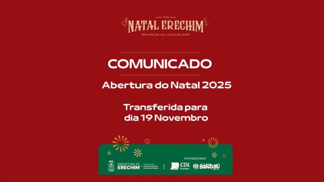 Devido à instabilidade do tempo, com previsão de chuva e alerta de temporal, a Abertura do Natal Erechim 2025 – Brilhos de luz, laços de amor, prevista para sábado (15), foi transferida para próxima quarta-feira (19), véspera de feriado.