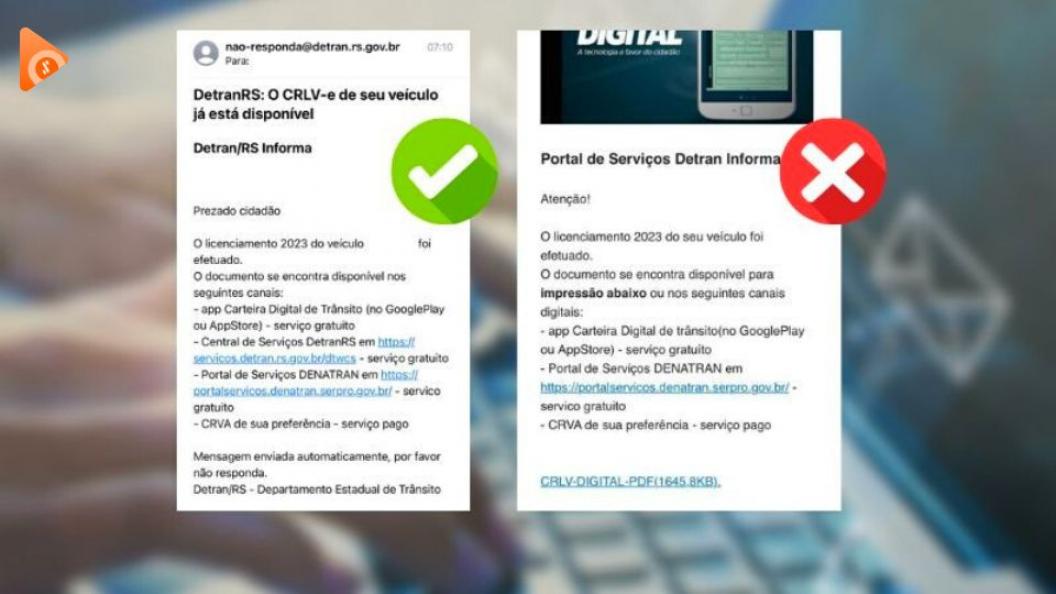 O DetranRS alerta para mais um golpe virtual, dessa vez envolvendo o documento do licenciamento 2023. Uma mensagem falsa é enviada por e-mail, bem parecida com a que a Autarquia envia, porém com um link onde seria possível baixar um arquivo em PDF. Importante ficar atento e não clicar no link, pois o DetranRS não envia o certificado de licenciamento por e-mail, ele só pode ser gerado pelo proprietário do veículo, dentro dos canais oficiais de atendimento. O link na verdade é um phishing, tipo de fraude em que dados pessoais são coletados para serem usados posteriormente em crimes virtuais.