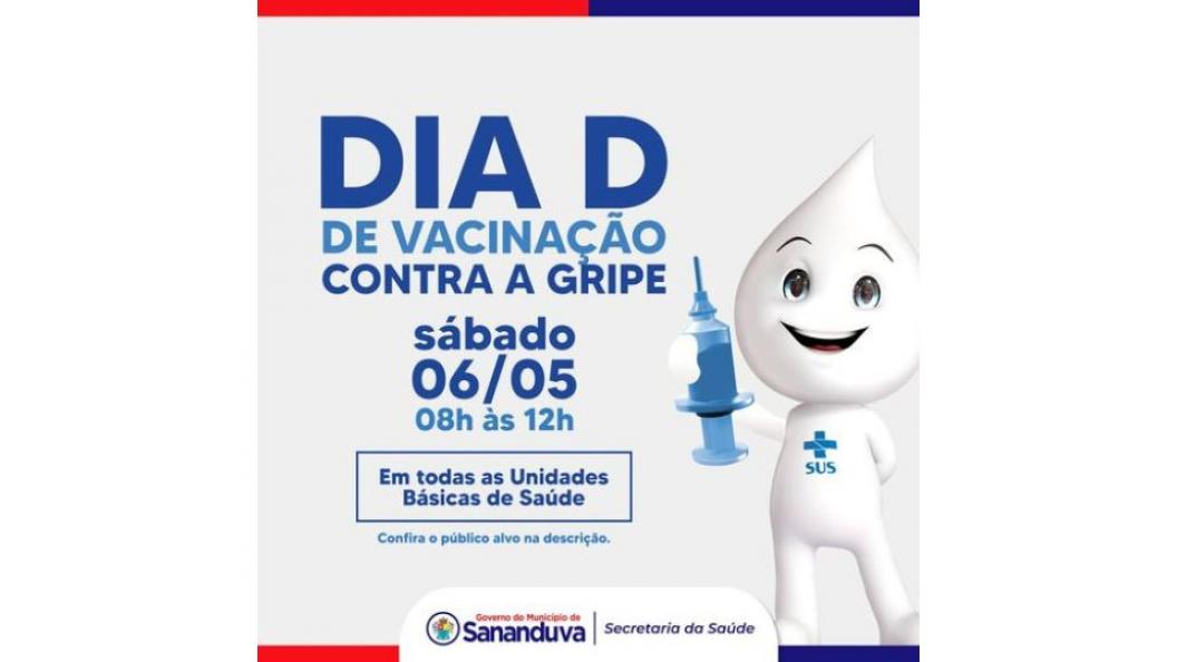 Acompanhando a 25ª Campanha Nacional de Vacinação contra a Influenza que ocorre até o dia 31 de maio, a Secretaria da Saúde do município de Sananduva promoverá no próximo sábado (06) o Dia D de Vacinação contra a Gripe.