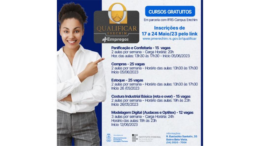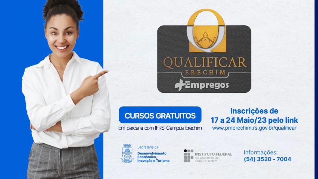 A Secretaria Municipal de Desenvolvimento Econômico, Inovação e Turismo, em parceria com o Instituto Federal de Educação, Ciência e Tecnologia do Rio Grande do Sul (IFRS) – Campus Erechim, abre inscrições para cinco novos cursos de qualificação gratuitos através do Qualificar Erechim + Empregos. O edital com todas informações pode ser acessado clicando no link a seguir: https://www.pmerechim.rs.gov.br/edital/51/n0162023-para-selecao-dos-interessados-em-participar-dos-cursos-de-qualificacao-profissional-do-programa-qualificar-erechim--empregos
