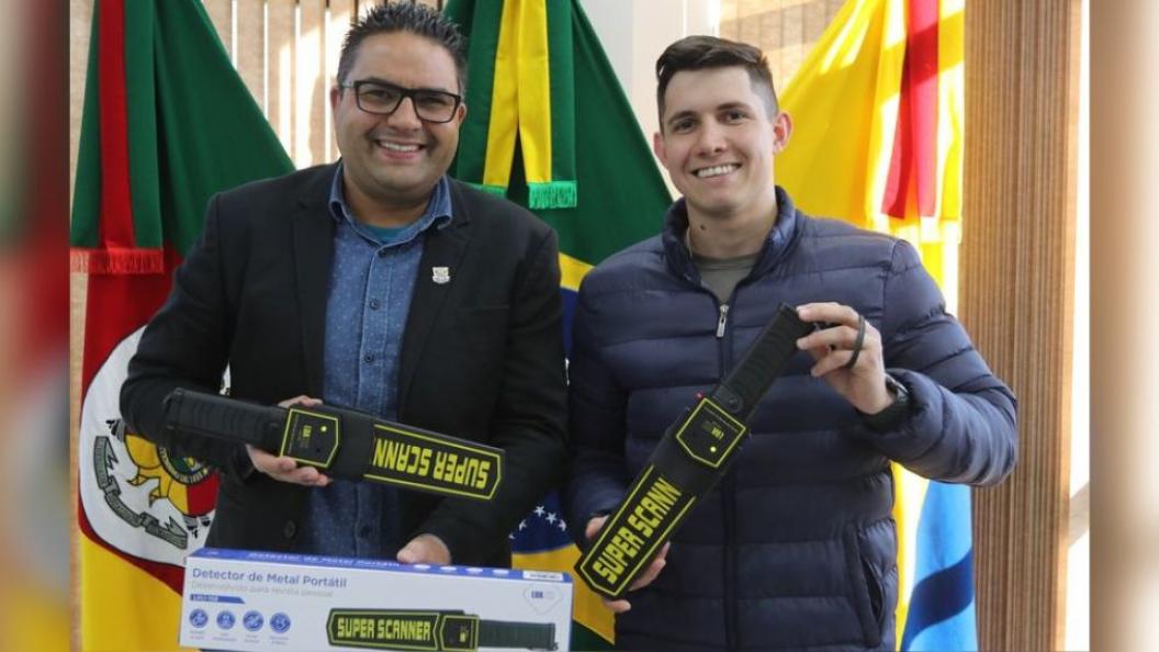 Na tarde de segunda-feira (19), o prefeito de Água Santa, Eduardo Picolotto, entregou a doação de 02 bastões detectores de metais para o secretário de educação e cultura, Daniel Poletto de Souza, para que seja usado na revista de funcionários, professores e alunos da Escola Municipal de Ensino Fundamental Padre Raimundo Damin.