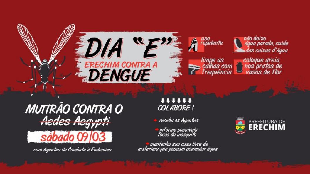 Por determinação do prefeito de Erechim, Paulo Polis, representantes das secretarias de Saúde, Meio Ambiente, Obras Públicas, Gestão e Governança, Defesa Civil, realizaram uma reunião, na manhã desta terça-feira (5), para organizar o “Dia E: Erechim contra a dengue”, a ser realizado no próximo sábado (9). Este grande mutirão de combate à dengue vai iniciar as 8h, em frente à prefeitura, e se estende para os bairros, além de orientação na Esquina Democrática. O objetivo é reforçar a orientação, tirar dúvidas, ressaltar a importância da prevenção.