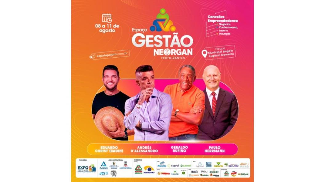 A 7ª edição do Espaço Gestão Neorgan vai apresentar palestrantes que trarão uma rica diversidade de experiências e conhecimentos, abordando temas fundamentais para o desenvolvimento pessoal e profissional. Suas histórias inspiradoras e ensinamentos práticos têm o potencial de motivar e transformar a vida de quem os ouve. O evento acontece junto à 12ª Expo Tapejara que abre nesta quinta-feira (08), véspera de feriado municipal, com o Fórum do Agronegócio e palestra magna com Paulo Herrmann.