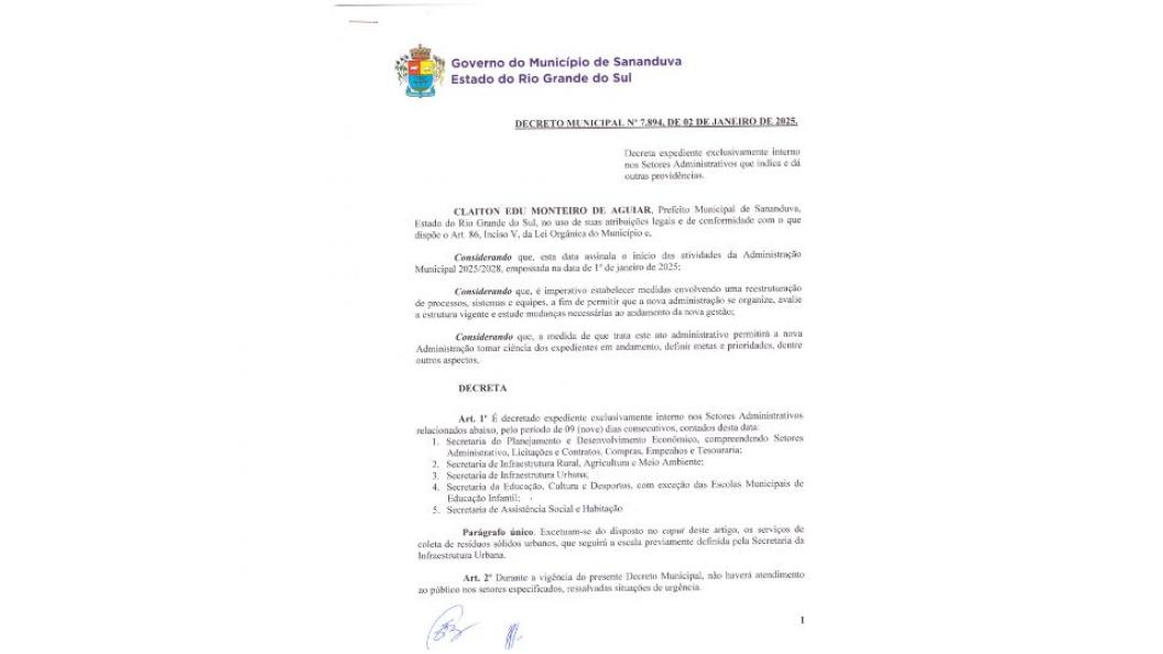 O Prefeito Municipal de Sananduva Claiton Edu Monteiro de Aguiar, no uso de suas atribuições legais e de conformidade com o que dispõe o Art.86, Inciso V, da Lei Orgânica do Município, decreta expediente exclusivamente interno nos Setores Administrativos do município, pelo período de 09 dias consecutivos, contados a partir da data de publicação do Decreto.