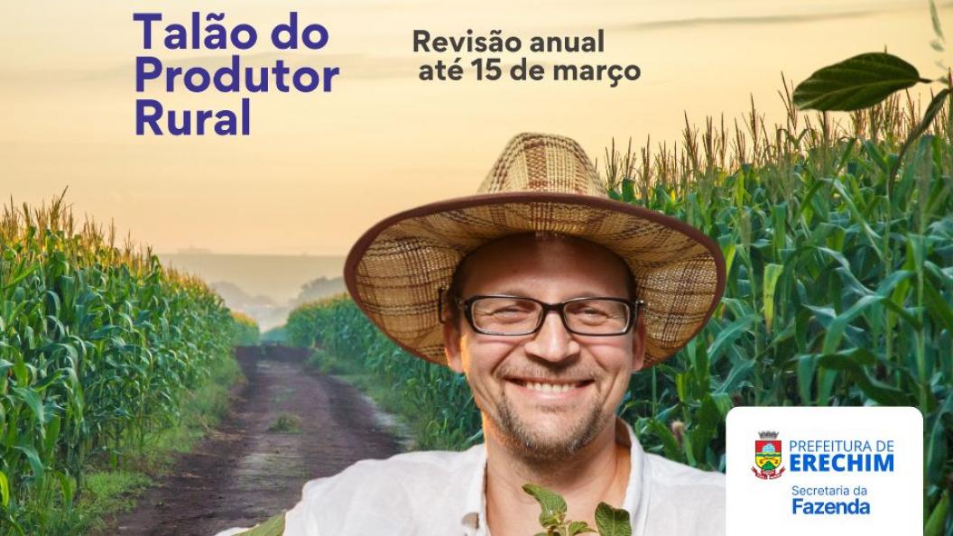 Atenção para o prazo anual dos talões de produtor rural. A Prefeitura de Erechim, através da Secretaria da Fazenda, comunica que o prazo para apresentação, revisão ou retificação dos talões por parte dos produtores rurais será realizado até 15 de março de 2025. Deverão ser apresentados na Divisão de ICMS e Produtores Rurais todos os talões, terminados ou não, que contenham notas fiscais emitidas no ano-base 2024.