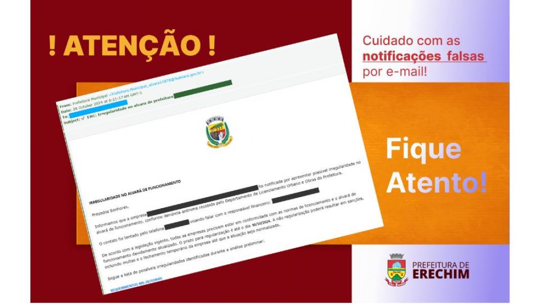 A Prefeitura de Erechim reforça o alerta aos contribuintes para notificações falsas referentes a Alvarás que tem sido enviado por e-mail, por contas falsas que se passam pelo município de Erechim. Os e-mails oficiais da Administração Municipal são sempre do domínio ...@erechim.rs.gov.br.