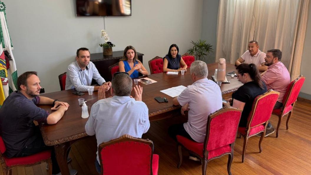 O vice-prefeito Flávio Tirello, o secretário de Desenvolvimento Econômico, Inovação e Turismo de Erechim, Emerson Schelski e o secretário de Gestão e Governança, Edgar Marmentini, receberam na manhã desta segunda-feira (24), no Salão Nobre, empresários que tem empresas instaladas no Corredor do Desenvolvimento, trecho as margens da RS-135, entre o posto do Comando Rodoviário da Brigada Militar até o trevo de acesso ao Distrito de Capoerê. Também acompanharam o encontro, servidores e a assessora parlamentar da Deputada Estadual Delegada Nadine, Andressa Vicentini.