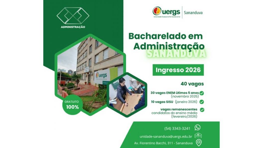 A Universidade Estadual do Rio Grande do Sul (UERGS), Unidade de Sananduva, abriu 40 vagas para o curso superior de graduação em Administração.